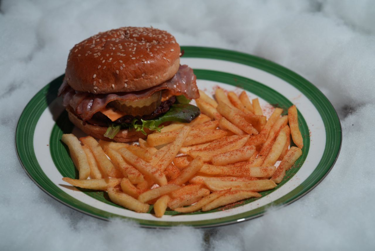 Quarter pound beef patty with smoky bacon, two slices of cheddar cheese, lettuce, tomato, pickles.